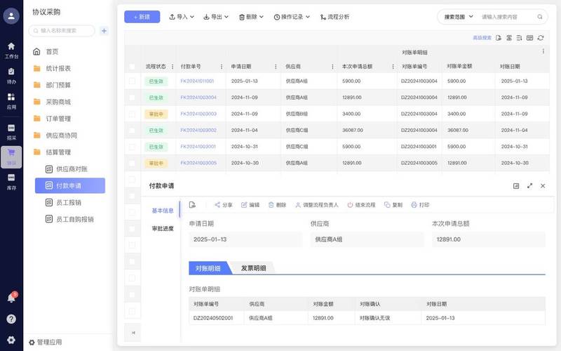 建设 SRM 供应商关系管理系统,实现供应商准入、寻源报价、采购订单、送货收货、质检、对账结算、绩效评估全流程线上协同,提升采购效率、降低成本、实现流程透明化与可追溯。