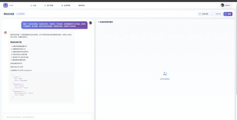 - **应用创建与路由**:根据 `initPrompt` 让 AI 自动路由代码生成类型(HTML / 多文件 / Vue 项目)。