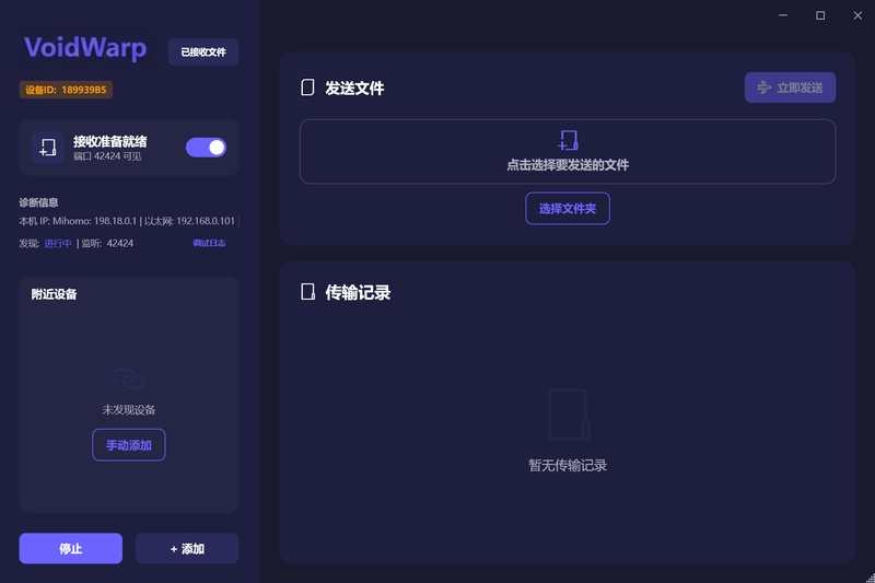 VoidWarp 是一款由个人独立设计与开发的高性能跨平台局域网文件传输系统,采用 Hybrid Core(核心逻辑与平台 UI 解耦) 架构。核心业务库以 Rust 编写,通过 FFI / JNI 桥接在 Windows 与 Android 双端运行,兼顾内存安全与系统级 I/O 性能。