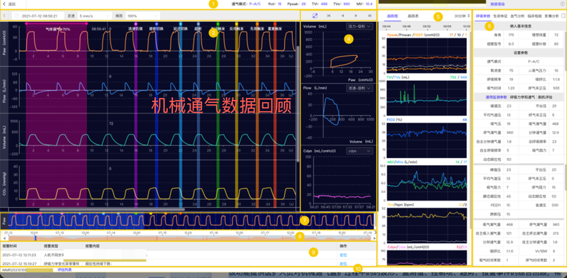 该功能提供医护人员对机械通气监护过程中的的波形、监测值、控制项、趋势、报警事件的综合回顾,帮助医护人员对机械通气监护过程中的各个参数情况回顾了解并通参考指定数据提交评估意见。