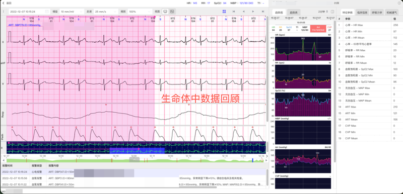 医护人员及分析员还不能全面的了解患者某段时间的体征趋势变化或某个时段报警的变化情况。数据回顾界面可从不同的模块及角度展示患者转归情况,为医护人员及分析员提供临床参考。