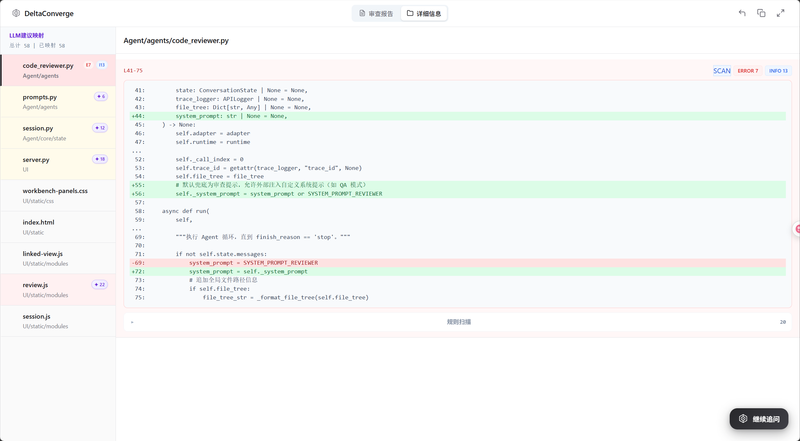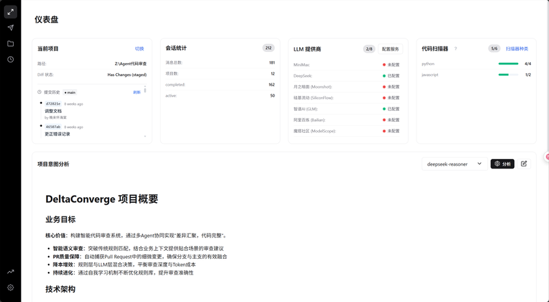 项目是一个多Agent协同的智能代码审查系统,主要功能包括:1)项目意图解析:自动读取README、代码结构和提交历史,生成业务语义上下文;2)上下文调度规划:根据Diff复杂度动态选择差异级、函数级、文件级上下文,平衡准确率与Token消耗;3)规则+LLM融合审查:结合静态规则与大模型推理,按置信度输出更稳健的审查建议;4)静态扫描并行集成:可联动Bandit、Ruff、ESLint等工具;5)结果流式展示与可追踪:支持审查过程可视化、冲突记录与持续优化,形成可迭代的质量治理闭环。