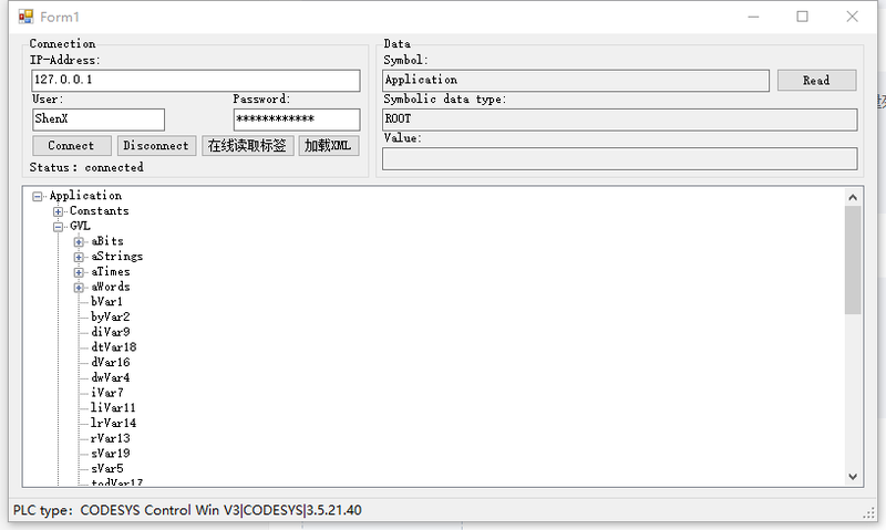 基于.Net4实现Codesys V3平台私有协议通讯,其功能与Codesys官方的PLCHandler类似,可以在线从获取PLC获取全局符号变量列表,支持批量读取符号变量,支持单点写入符号变量