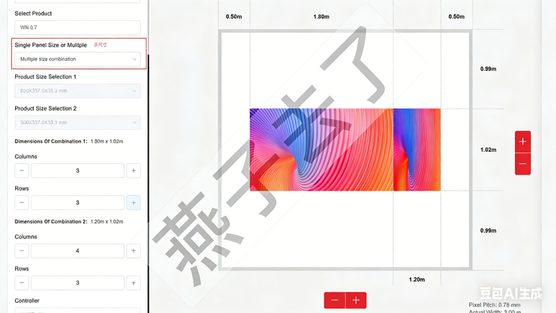 1.墙体图:基于选择的墙体尺寸以及屏幕数量生成对应的墙体屏幕图,并且所有相关的尺寸信息随之变化,并且增加墙体尺寸限制和屏幕最大数量限制,并支持多尺寸选择和拼接。