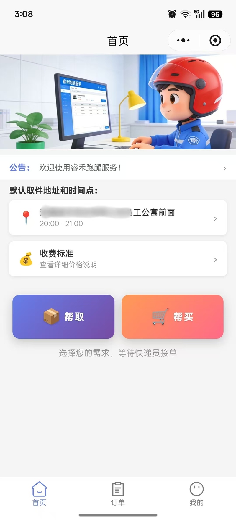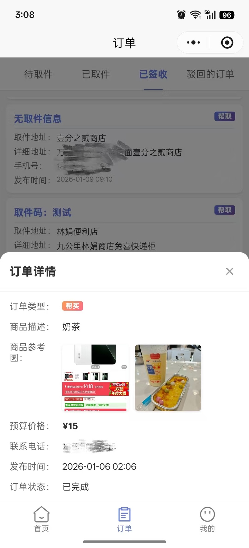 用户端:支持用户在线下单,填写取件地址、驿站信息、取件码等订单详情,可实时查看订单进度,与代取员在线沟通,无需添加微信,避免群内消息混乱。