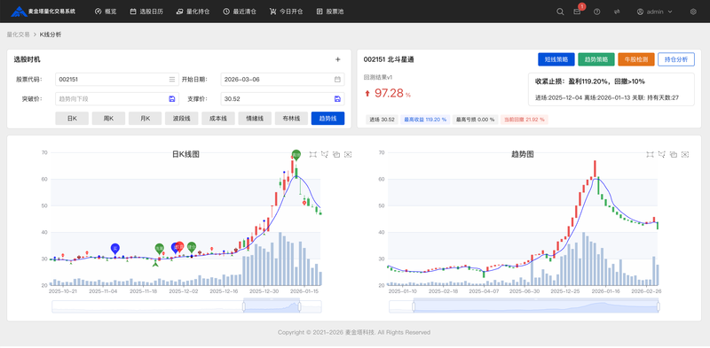 本项目旨在开发一套集策略回测、可视化买卖点标注、绩效评估(胜率/收益率)于一体的量化交易辅助系统。通过将抽象的交易策略具象化为K线上的明确信号,并提供客观的回测数据支撑,帮助交易者克服认知偏差,从主观臆断转向数据驱动的概率决策,构建符合个人风格的纪律化交易体系。