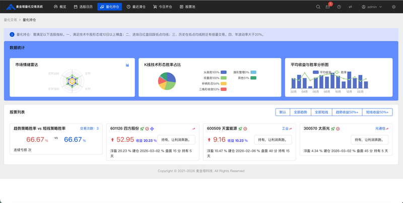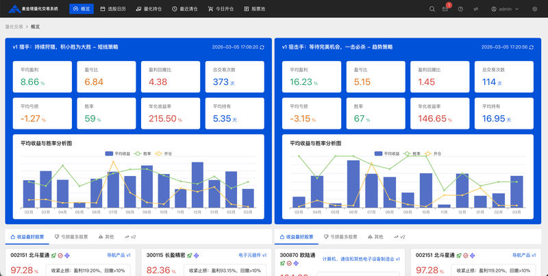 多策略绩效看板模块:并行展示不同交易策略(如短线"猎手"、趋势"狙击手")的核心业绩指标,支持横向对比。