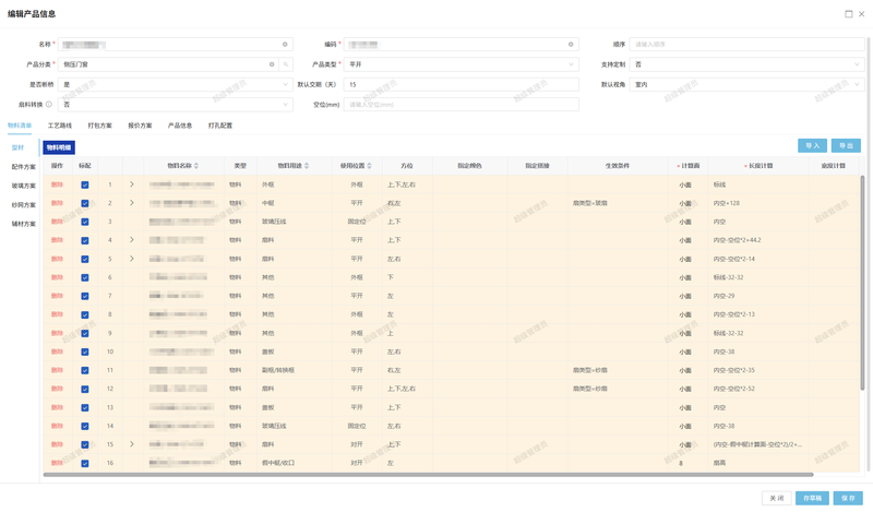 2、产品配置模块:支持门窗规格配置、型号管理及参数选择。