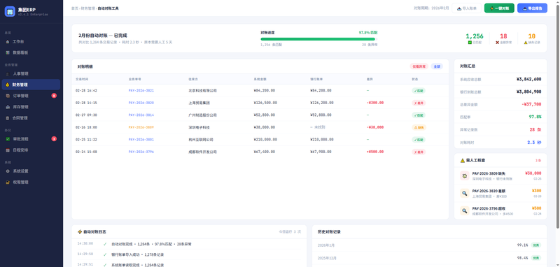 核心亮点:自动对账模块将原本5天人工流程压缩至2秒;