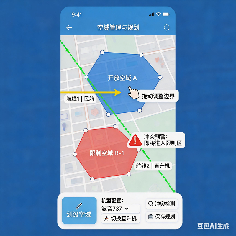 ◦ 智能规划:结合气象、空域数据自动生成航线,支持eVTOL、无人机多机型适配。
