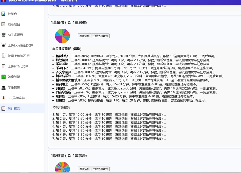 教师备课与管理:教师通过后台上传教案、作业,系统自动生成练习题,成绩实时统计,辅助教学决策。