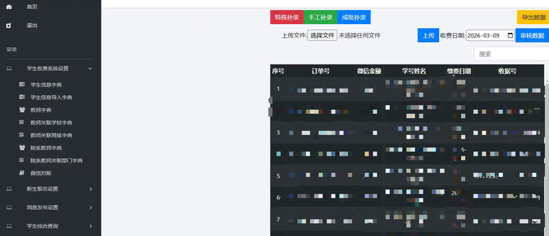 我负责:学生信息管理(对接教务系统),收费标准设置(学费、住宿费、代收费等),非税系统对接(自动生成电子发票)等模块
