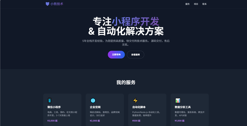 本项目是个人技术工作室的官方网站,旨在展示小程序开发、网站建设和自动化脚本等技术服务。通过响应式设计和现代化的界面,向潜在客户展示专业能力和服务范围,解决个人开发者缺乏专业展示平台的问题。适用于自由职业者、技术工作室建立线上品牌形象,获取客户咨询。