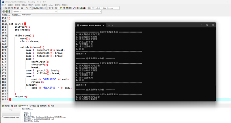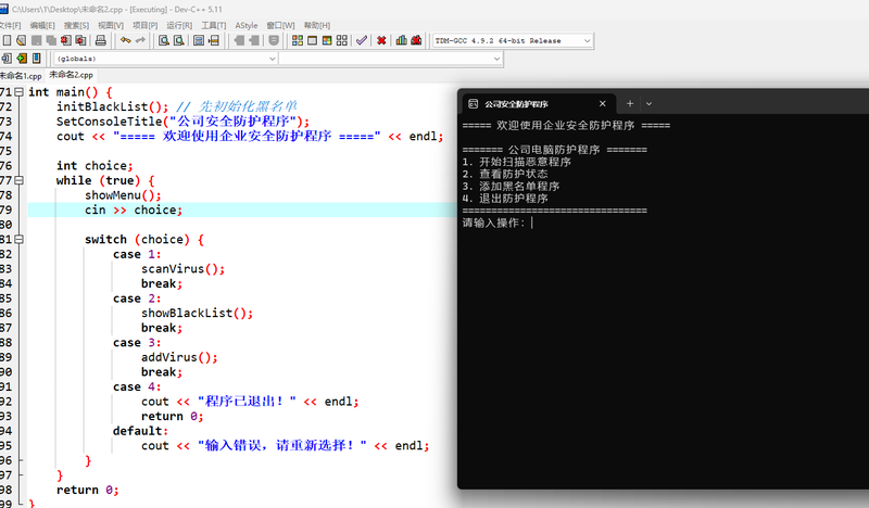 我负责完成项目的全流程开发,包括需求分析、代码编写与功能调试。项目基于 C++ 语言 开发,结合 Win32 API 实现 Windows 平台下的系统进程监控与查杀;通过结构体与数组存储月度财务数据与员工信息,利用循环与数学公式完成收支统计、平均值计算及业绩增长率分析,最终实现了集安全防护与财务管理于一体的轻量化企业管理工具,代码结构清晰、交互友好,可直接在 Windows 环境下编译运行。