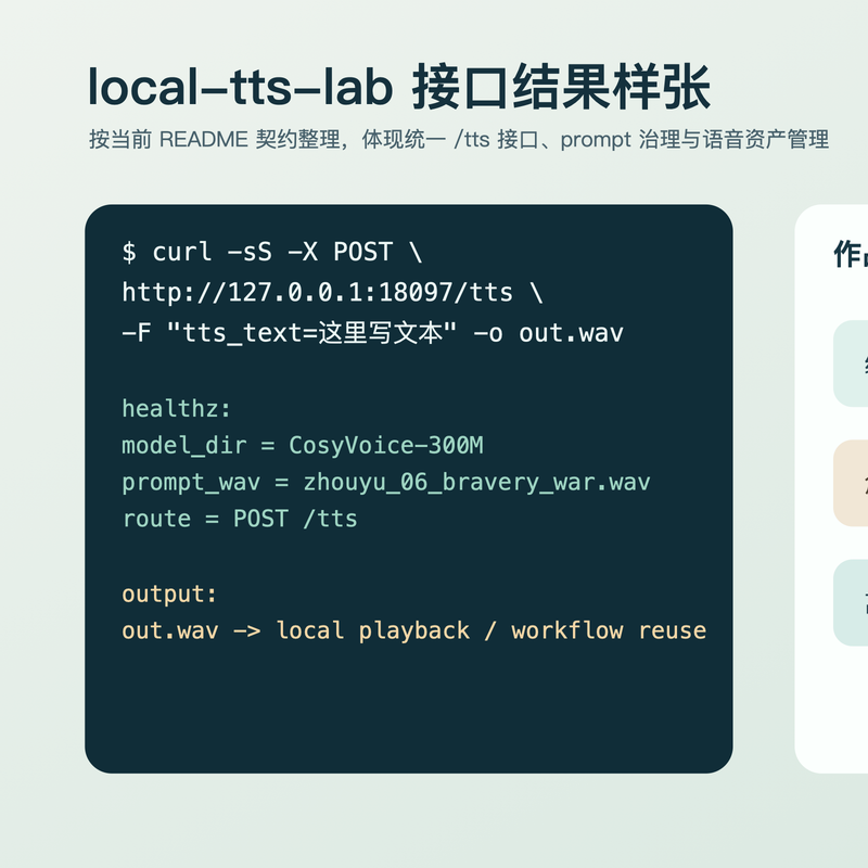 local-tts-lab 面向需要离线文本转语音、角色语音资产和统一调用入口的本地工具场景,核心不是做一次语音 demo,而是把 TTS 能力、prompt 规则和语音素材整理成可复用的工具面。它适合本地 AI 工具、语音工作流和开发工具场景。