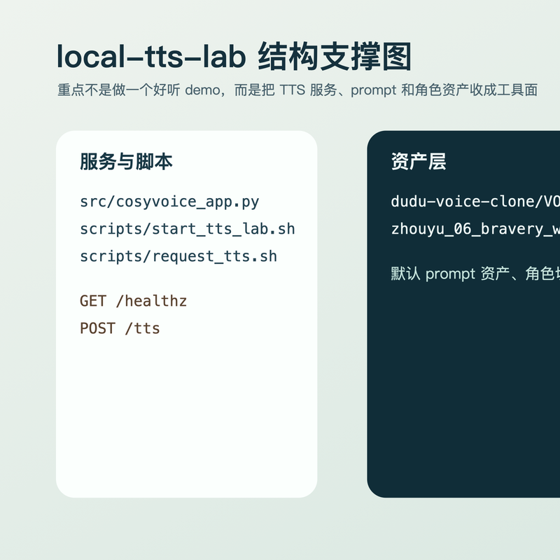 我负责 Python 服务层、HTTP 接口、语音资产组织、prompt 规则和调用脚本。实现重点是把离线 TTS 从零散实验收成能给脚本、Agent 或其他工具稳定调用的本地工具面。
