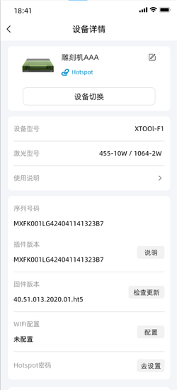一、设备连接与管理双模连接支持Wi-Fi配网与设备热点直连两种模式。当局域网内搜索不到雕刻机时,自动引导用户切换至设备热点,确保户外市集、临时场地等无网络环境也能正常使用。设备信息看板实时显示当前连接的设备型号(如XTOOL-F1)、激光模组配置(455-10W/1064-2W)、固件版本及序列号。