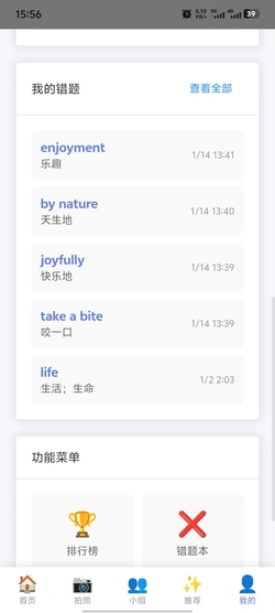 1、项目具体功能模块:-单词学习(闪卡、掌握度追踪、错题本)-语法学习(专题学习、AI智能解析)-阅读理解(每日精读、AI伴读)-听力练习(AI生成、TTS语音)-作文练习(AI批改)-图片阅读识别(完形填空智能识别)-游戏化系统(积分、徽章、学习小组、排行榜)-任务系统(每日/每周/组队任务)-管