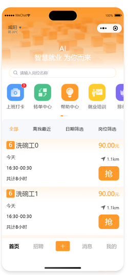 功能模块:个人信息模块:获取用户微信昵称,头像,手机号码,位置信息;岗位列表和岗位详情。上下班打卡模块:上传带定位地址的图片到后端完成上下班记录。招聘模块:岗位列表,有推荐,最近,最新,选择城市和地区来进行筛选。岗位详情模块:有地图显示定位,在地图上选择地址等。消息模块:消息聊天对话的实现。我的模块
