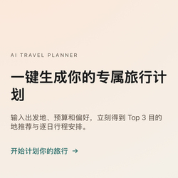 ✈️eTravel平台主要功能?1.一键生成旅行计划用户只需输入出发地、预算和个人偏好,平台就会自动: • 推荐Top3旅行目的地 • 生成逐日行程安排这大大减少了规划旅行的时间和精力。⸻?2.个性化推荐eTravel使用AI分析用户输入的信息,为你量身定制行程。它考虑: • 预算范围 • 偏好类