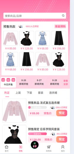 和大部分的电商购物app类似,其中的特点是有AI虚拟试穿功能,让用户能在购买前直观预览服饰的上身效果,有效降低了退货率并提升了购物满意度。有商品信息,预售商品,商品详情,试穿,立即购买,加入购物车,订单(待付款,待发货,已发货,退款等)等电商应用的功能