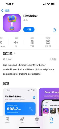 PixShrink是一款注重隐私的照片压缩软件,100%在设备端运行——无需上传,无需注册账号。功能:-批量压缩,快速节省存储空间-支持格式:JPG/PNG/HEIC/GIF/WebP-前后对比滑块,支持缩放和平移,方便查看细节-保存到“照片”应用,可选择删除原图-元数据控制隐私:-仅在设备端处理,