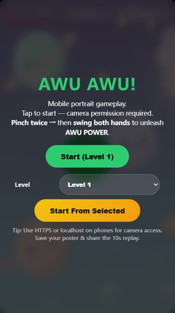 具体模块,功能描述Awu是面向海外年轻群体与家庭用户的手势操控休闲小游戏,基于摄像头实时手势识别技术,控制角色移动捕食飞虫,闯关共设20个趣味关卡,操作直观、互动性强。游戏采用免费试玩+视频广告模式:用户每日可免费体验3次,后续继续游戏需观看激励视频,以此实现商业化变现。游戏内置社交传播能力:每关自