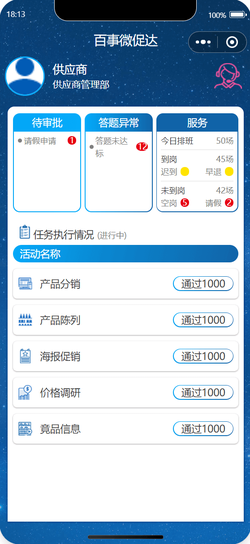 1、核心模块-考勤管理:上班打卡、下班打卡、考勤记录查询-任务管理:工作安排、任务执行、异常处理-销售管理:销售数据统计、销售奖励、业绩查询-排班管理:排班查询、工作安排2、辅助功能-培训学习:促销知识学习、考核答题-数据分析:销售数据图表展示、业绩分析-异常处理:考勤异常、答题异常处理-个人中心: