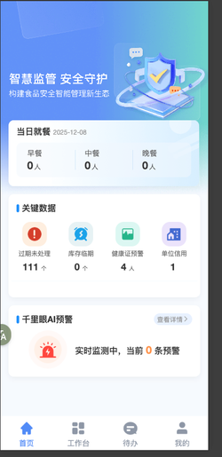 ###1、具体功能模块系统基于SpringBoot+Uniapp技术架构,核心分为6大功能模块:食材采购溯源模块、后厨过程管控模块、从业人员管理模块、抽检整改管理模块、信息公示模块、数据统计分析模块,覆盖校园食堂食品安全全流程管理,适配PC端管理后台与移动端操作端。###2、主要功能描述-**食材采
