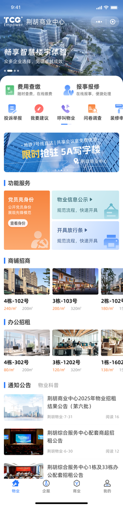 1.物业1.1费用查缴1.2报事报修1.3投诉举报1.4装修申请1.5智慧停车2.企服2.1入园申请2.2孵化申请、园区动态
