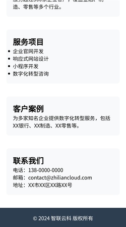 随着企业数字化转型的深入,智联云科作为专注于企业服务与云计算的科技公司,原有官网已无法满足品牌展示、业务推广及客户沟通的需求。为提升企业形象,强化市场竞争力,立项开发全新的企业官网,旨在打造一个集品牌展示、业务介绍、客户案例、在线咨询于一体的数字化门户,助力企业在数字化浪潮中抢占先机。本项目为智联云