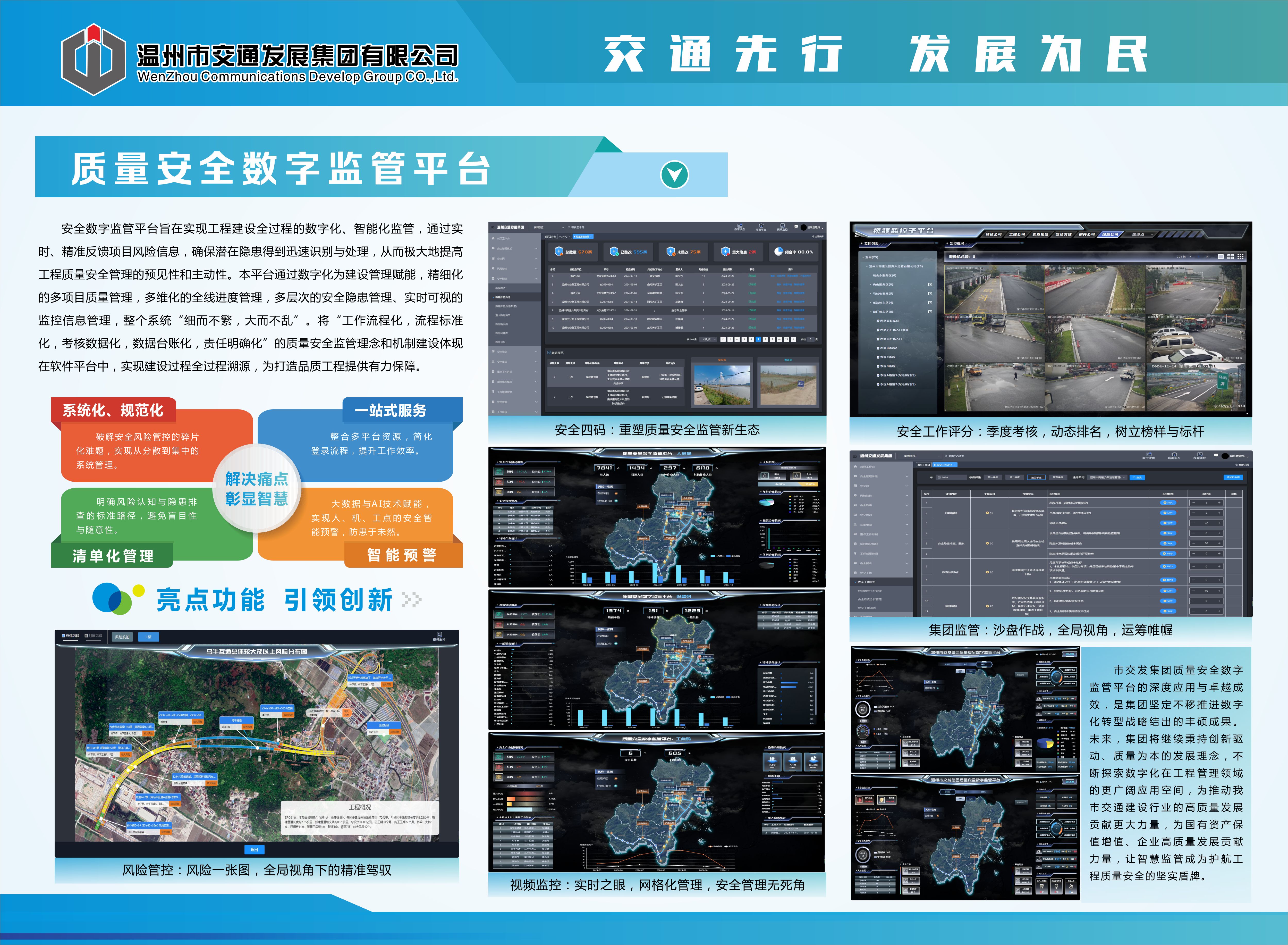 安全数字监管平台旨在实现工程建设全过程的数字化、智能化监管,通过实时、精准反馈项目风险信息,确保潜在隐患得到迅速识别与处理,从而极大地提高工程质量安全管理的预见性和主动性。本平台通过数字化为建设管理赋能,精细化的多项目质量管理,多维化的全线进度管理,多层次的安全隐患管理、实时可视的监控信息管理,整个