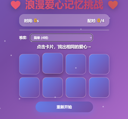 游戏副本5个难度等级:简单(4对)到大师(24对)爱心主题元素,包含多种爱心emoji特殊金色卡片增强游戏趣味性游戏机制计时系统与最佳成绩记录连击奖励机制(连续正确配对)时间加速道具(减10秒)等级经验值系统技术特色响应式设计,适配移动端3D翻牌动画效果粒子爆炸视觉反馈WebAudioAPI音效系统